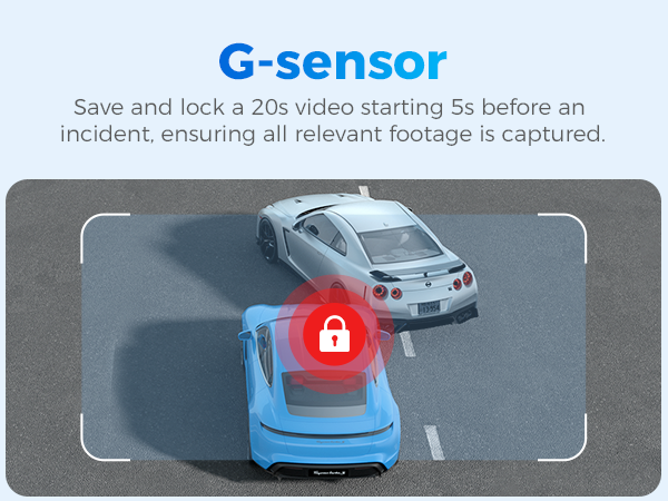 • The sensor used by Dashcam is a 3 -axis impact gravity acceleration meter used to detect the physical and gravity effects of the camera. Once the G-sensor is triggered, the current video file will be locked as an emergency file to ensure that it will not be deleted by the recording function.