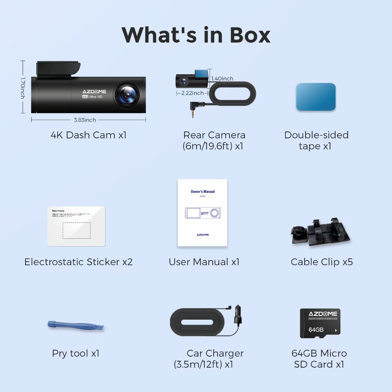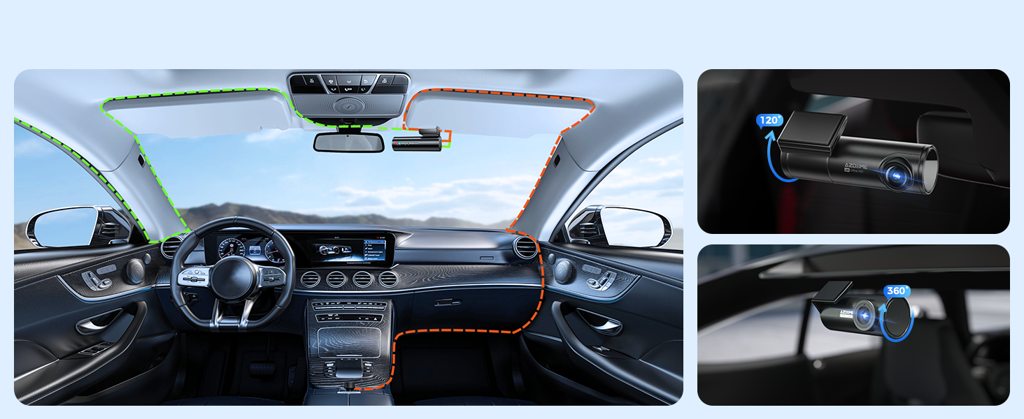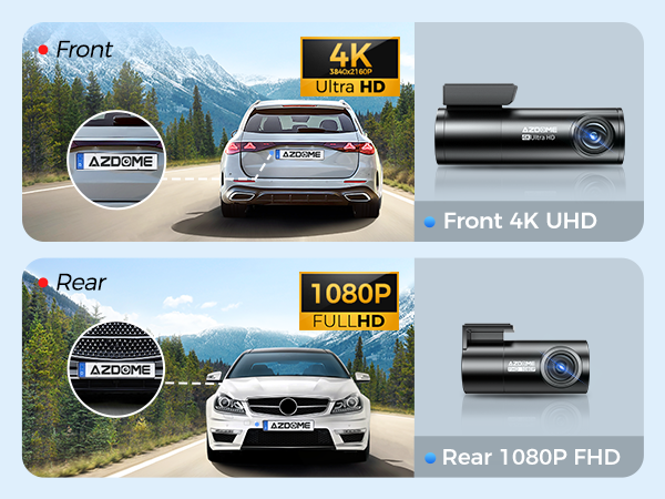 AZDOME M300S Dash Cam is equipped with 4K(2160P) UHD front camera and 1080P rear backup camera. Provide you much clearer footage capturing license plates from a distance. The rear cam is easily 360° adjustable with 27ft extension cable, works well for cars, suv, jeep, truck.