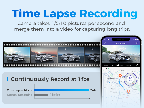 • 2. Time-Lapse parking mode, the dash cam can record continuously for 24 hours.