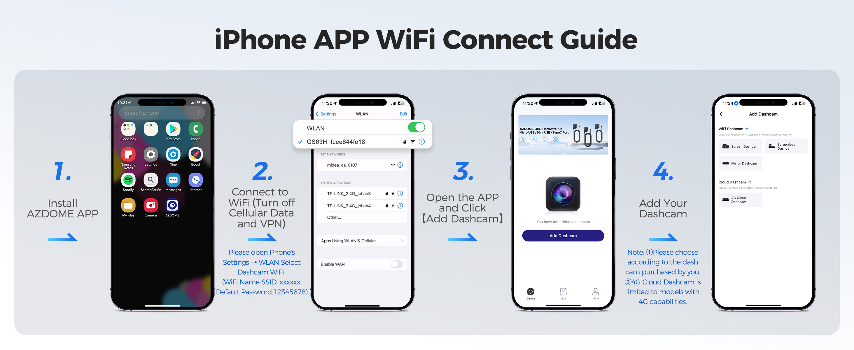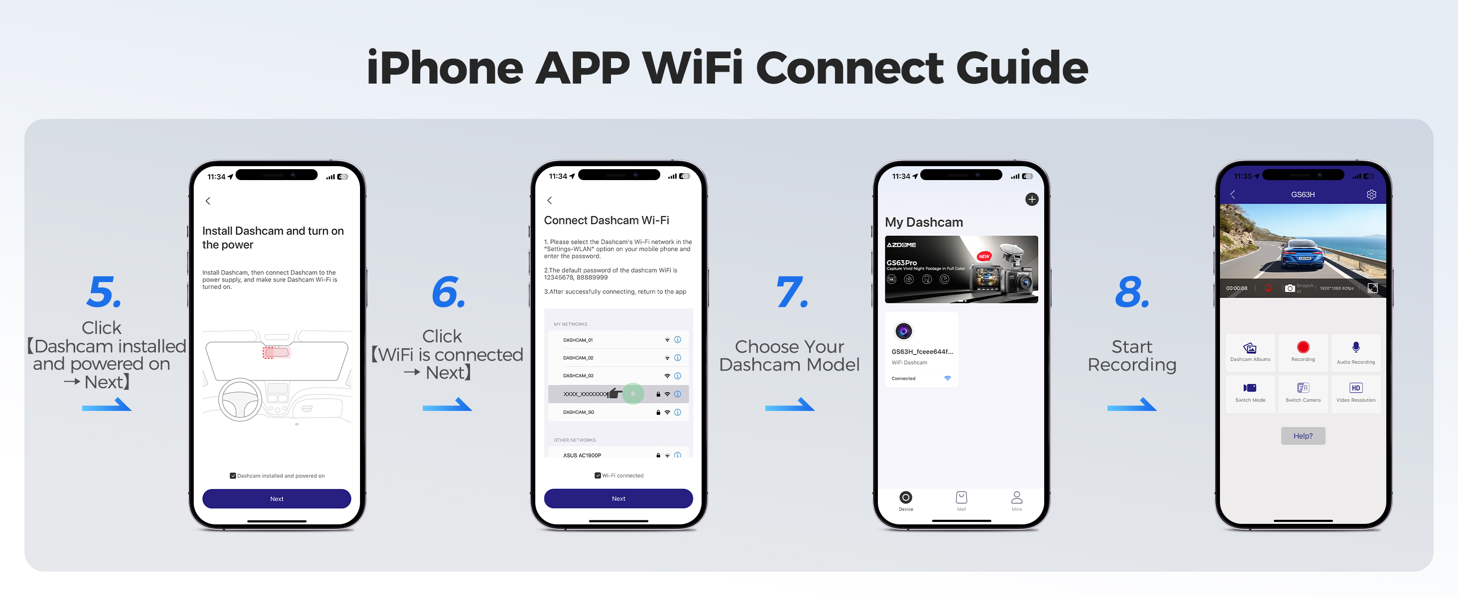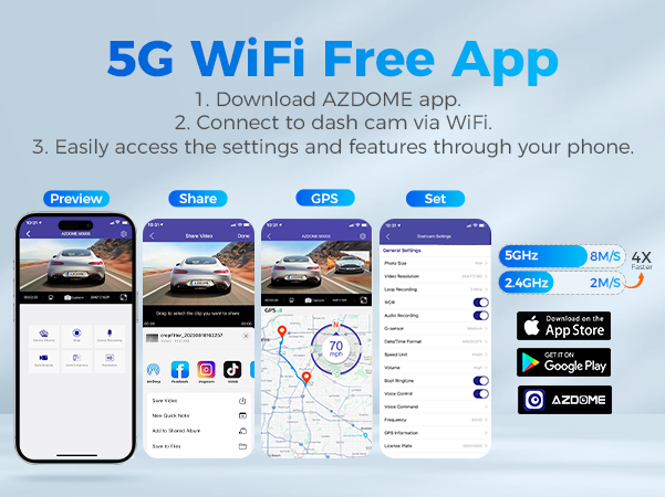 You can seamlessly connect your iOS or Android devices utilizing the dual band 5GHz and 2.4GHz WiFi functionality. Experience the convenience of our AZDOME app, allowing you to effortlessly view, download, and share your videos with friends and family at a single touch on social media platforms or through any messenger app.
