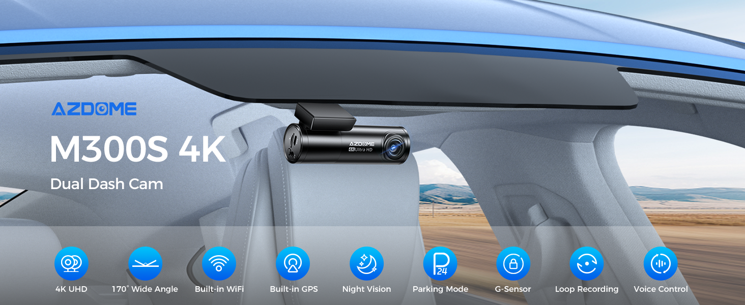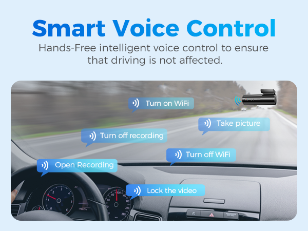 M300S smart car dash camera comes with 6 voice commands, you can completely release your hands and travel without worry. Simply give voice commands to finish your photo/video taking tasks and more, all hands-free. Note: say a command, but ONLY support English. "Turn on/off WiFi, Take picture, Open/Turn off recording, Lock the video"